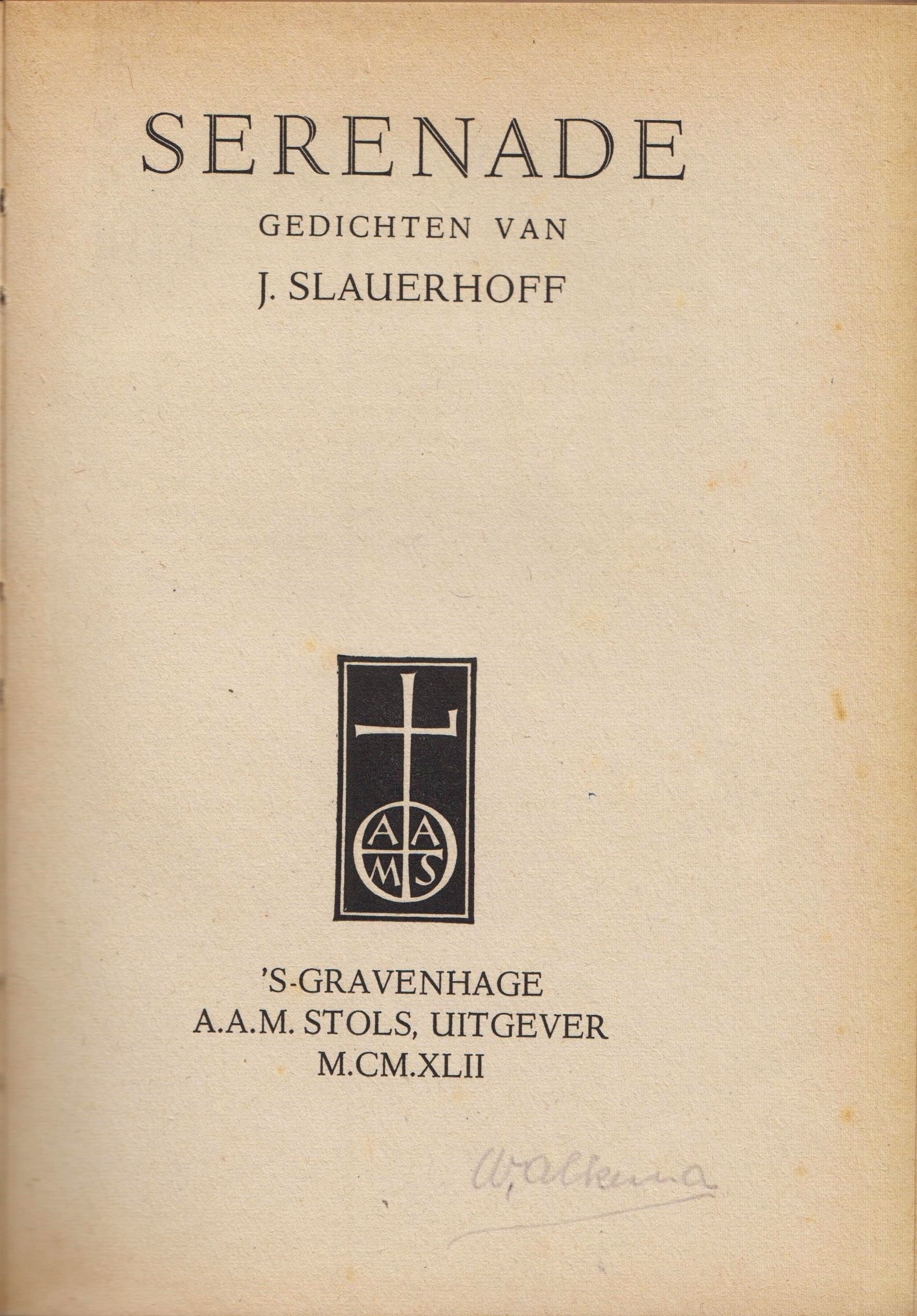 15. SLAUERHOFF, J. Serenade. Den Haag, A.A.M. Stols, 1942. Halflinnen. 40 p. 3e druk. Mooi exemplaar.
