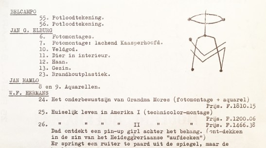 * Aankondiging voor een leuke expositie in de Boekenweek van (foto)montages en tekeningen van Belcampo, Jan G. Elburg, Jan Hamlo (sic), Prof. J. Huizinga, Wim Hussem, Gerrit Kouwenaar, Lucebert, Adriaan Morriën, E. du Perron, Gerard (van het) Reve, Paul Rodenko, Vestdijk Leo Vroman en J.B. Charles. Hermans is de enige tekenende schrijver die, behalve titels, uitgebreide beschrijvingen en prijzen van zijn kunstwerken geeft. ‘Huiselijk leven in Amerika III’ (‘heeft betrekking op de dromen van Dad. Hoe goed zou hij zich voelen wanneer hij iets beleefde met de in bikinibadpakje geklede dame wier mond zo gevaarlijk dicht bij de zijne zweeft’) kost bijvoorbeeld f 1723,-. Janssen/ Delvigne 200. Hoogst zeldzaam en efemeer!
