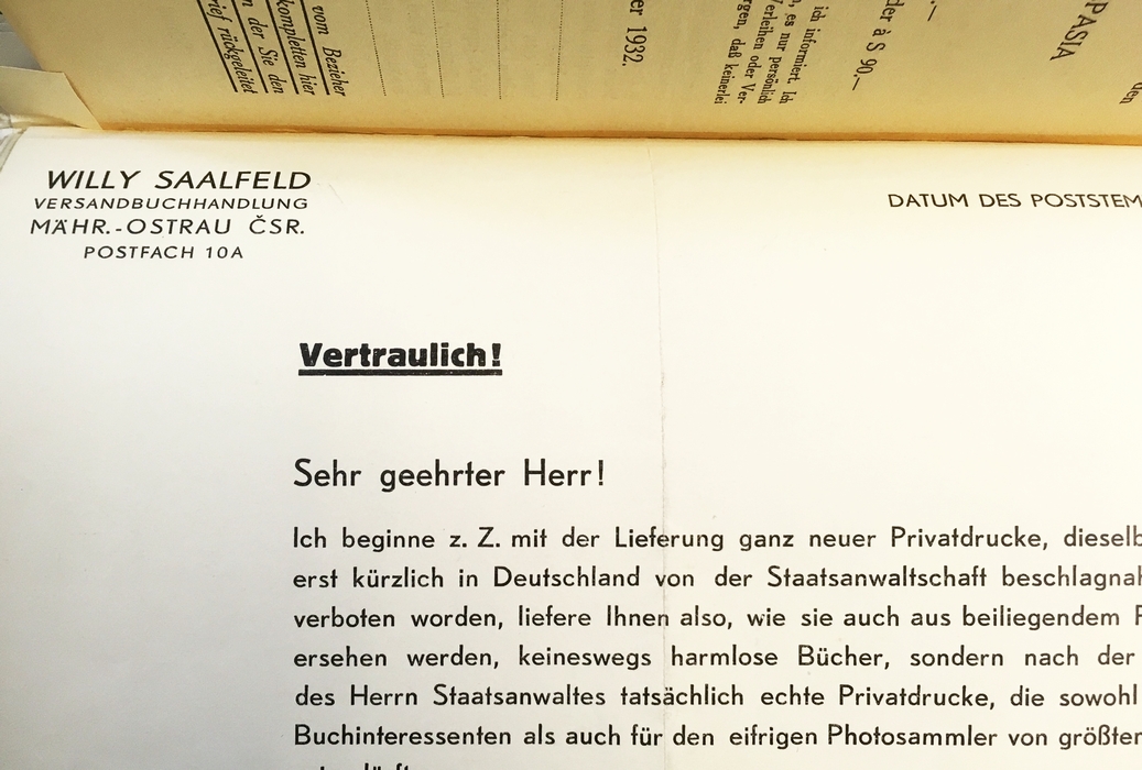 b. Prospect for erotic private publications that were confiscated in Germany. Versandbuchhandlung Saalfeld in Tschechien. About 1933. 1 p.