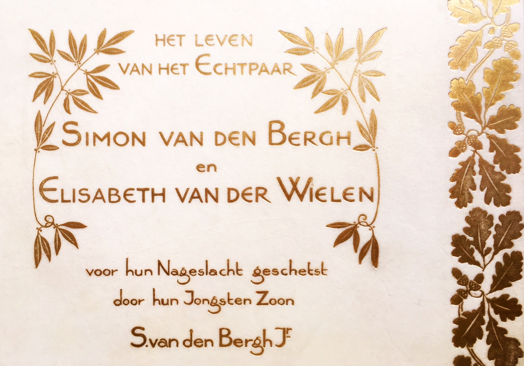 20. BERGH Jr., S. van den Het leven van het echtpaar Simon van den Bergh en Elisabeth van der Wielen, voor hun nageslacht geschetst door hun jongsten zoon S. van den Bergh Jr. (Rotterdam, eigen beheer, 1908). 34 x 25 cm. Verguld heelperkament. 132 p. Alle sneden verguld. Met uitslaande bijlage (stamboom). Geïllustreerd met foto’s en vignetten (o.a. van C. Koppenol). Gedrukt op kunstdrukpapier, elke bladzijde met dubbel rood kader. 1e druk. Hoekje bovenaan afgebroken en door een restaurateur weer aangezet. De gouddruk is aan de rand hier en daar licht vervaagd.