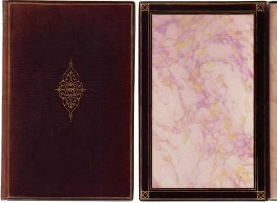 11. BOUTENS, P.C. Oud-Perzische kwatrijnen. (Met een (portret-)houtsnede van J. Franken Pzn.). Den Haag, (A.A.M. Stols), 1926. Rijk verguld heelleder in (later) foedraal. Kop verguld. (6), CVIII p. Gezet uit de Garamond en gedrukt door Boosten & Stols in rood en zwart in een oplage van 125 genummerde exemplaren. 1e druk. Rug licht verschoten.