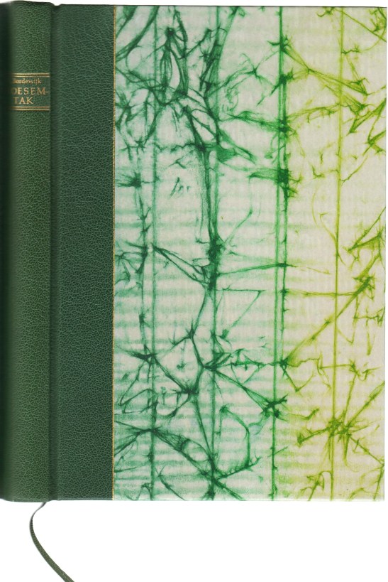 2. (DAAL, Geert van). BORDEWIJK, F. Bloesemtak. (Met vijf originele, gesigneerde/ gemonogrammeerde etsen van Wim van der Meij). Dodewaard, Distelkamp/ Arethusa Pers, 2001. Verguld halfleer met platten van gebatikt papier, in foedraal. 266 p. Gezet en gedrukt door De Distelkamp (Geert van Daal) op Simili Japon in een oplage van 125 genummerde exemplaren.