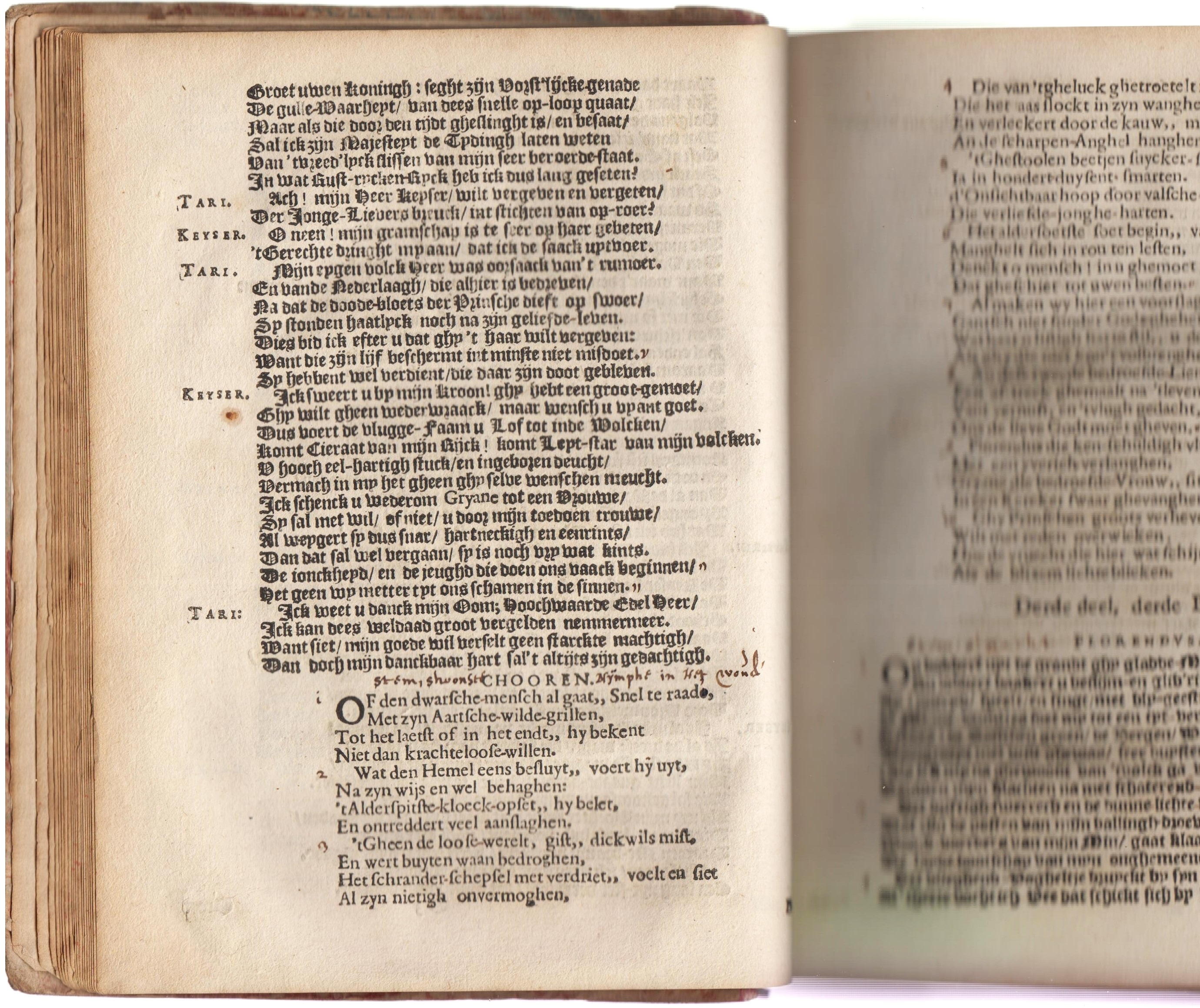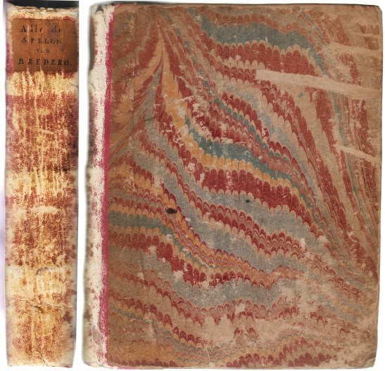BREDERO, G.A. Alle de Spelen. Van Gerbrand Adriaensz Bredero, Amsterdammer. Rotterdam, Pieter van Waesbergen, (1622). 19,4 x 15,6 cm. Achttiende-eeuwse band: rug van schapenleer, kartonnen platten overtrokken met marmerpapier. (6 (van 8)), 510 (van 512) p. (doorgaande signatuur). De gezette titelpagina (met alleen auteursnaam en titel) ontbreekt (als vaker), evenals tekstblad A4 (het eind van de voorrede/ de eerste tekstpagina van Griane). Gezet uit een romein en een gotische letter. Met een gegraveerde titel door Jan van de Velde in een mengtechniek van ets en gravure, naar een ontwerp van Willem Pietersz. Buytewech. Rug verweerd, hoeken gesleten, opnieuw afgesneden (geen tekstverlies). Naam en jaartal (‘1652’) op titelpagina. Handgeschreven inhoudsopgave tegenover de titelpagina. Binnenwerk hier en daar wat gevlekt.