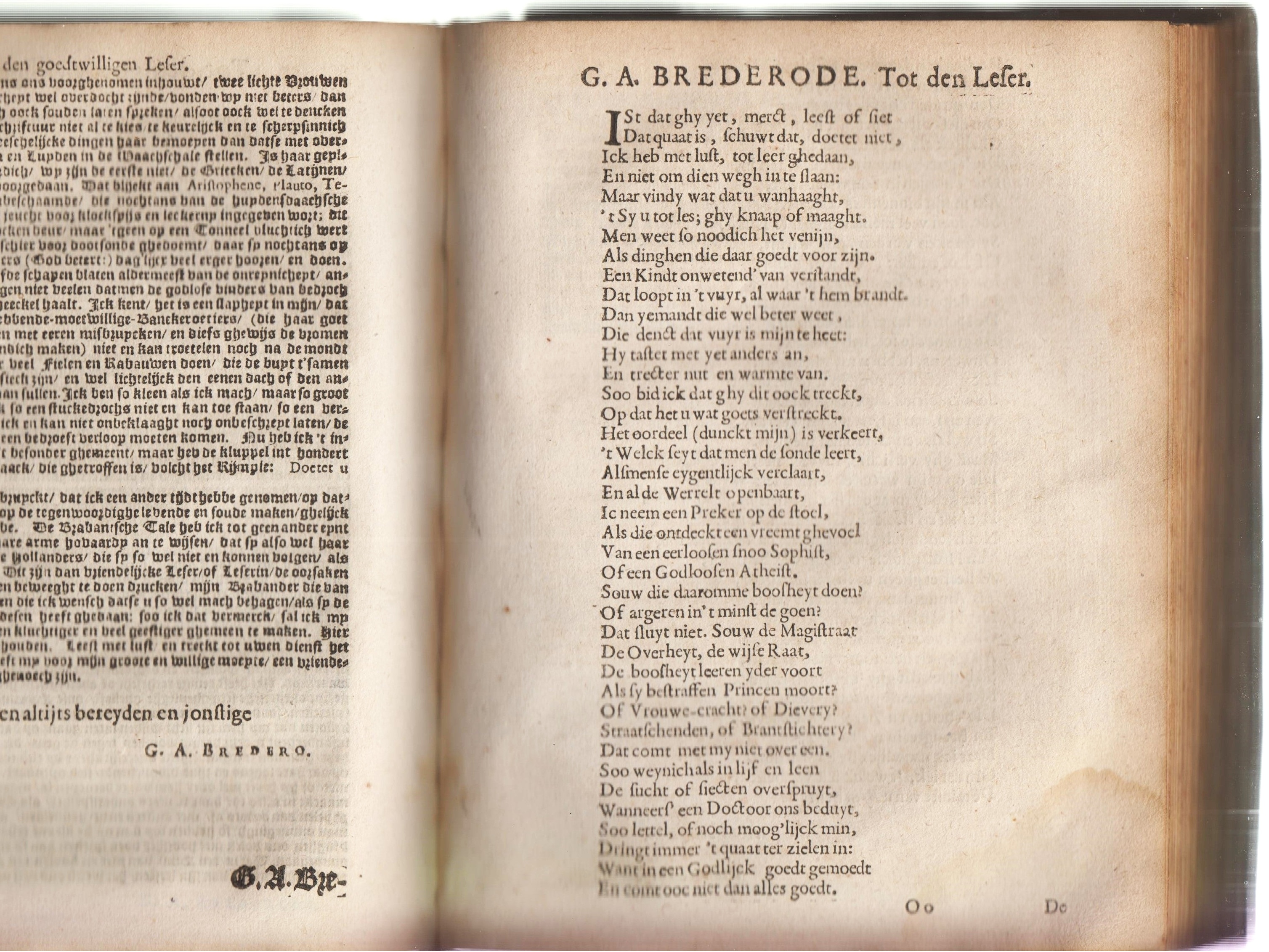 Bredero leeft weer! Ter gelegenheid van zijn vierhonderdste sterfdag op 23 augustus jongstleden worden er het hele jaar door Bredero-activiteiten georganiseerd. Ook verscheen een nieuwe biografie door René van Stipriaan, De hartenjager. Onze harten gingen sneller kloppen bij de vroege verzameld werk-uitgave van Bredero die onlangs op ons pad kwam. Aan deze Rotterdamse roofdruk, waarin Bredero’s bekendste stukken zijn opgenomen, is deze nieuwsbrief gewijd.