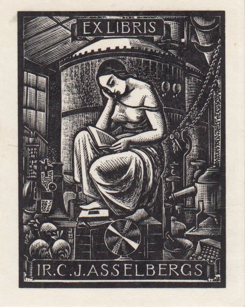 3. BUCKLAND WRIGHT, John Exlibris C.J. Asselbergs. Originele houtgravure op Japans Supernacré. 7,7 x 5,8 cm. Initialen ‘JBW’ in de prent. [1933].