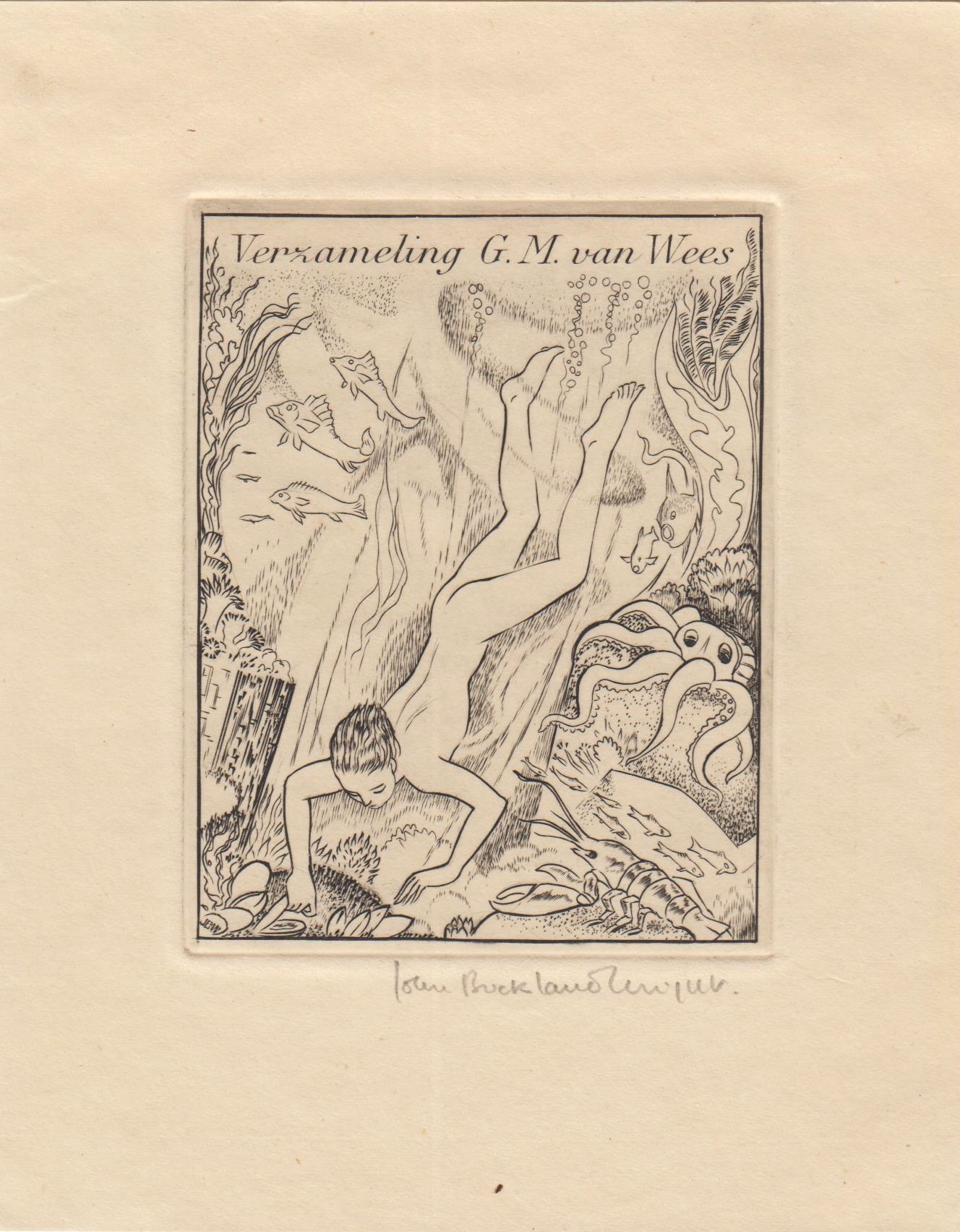 14. BUCKLAND WRIGHT, John Exlibris getiteld ‘Verzameling G.M. van Wees’. Originele kopergravure op getint Japans papier. 9,0 x 7,0 cm. Papierformaat 14,2 x 11,4 cm. Initialen ‘JBW’ linksonder in de plaat. Voluit gesigneerd in potlood. [1939]. In passepartout.