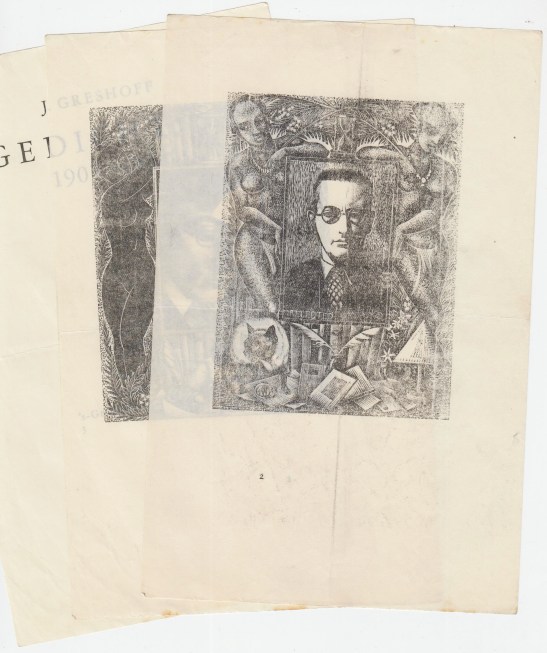 * Het eerste katern, losbladig, van een drukproef van Greshoffs eerste verzameldichtbundel. In deze proef zit niet alleen een losse afdruk van de houtsnede van John Buckland Wright die als frontispice voor Gedichten 1907-1964 gebruikt zou worden, maar ook een losse afdruk van een andere houtsnede van Buckland Wright die al snel door de kunstenaar afgewezen werd (in het blok gesigneerd ‘JBW’, gedateerd ‘1933’, gemerkt ‘REJECTED’). Van de afgewezen houtsnede zijn denkelijk maar enkele afdrukken gemaakt.