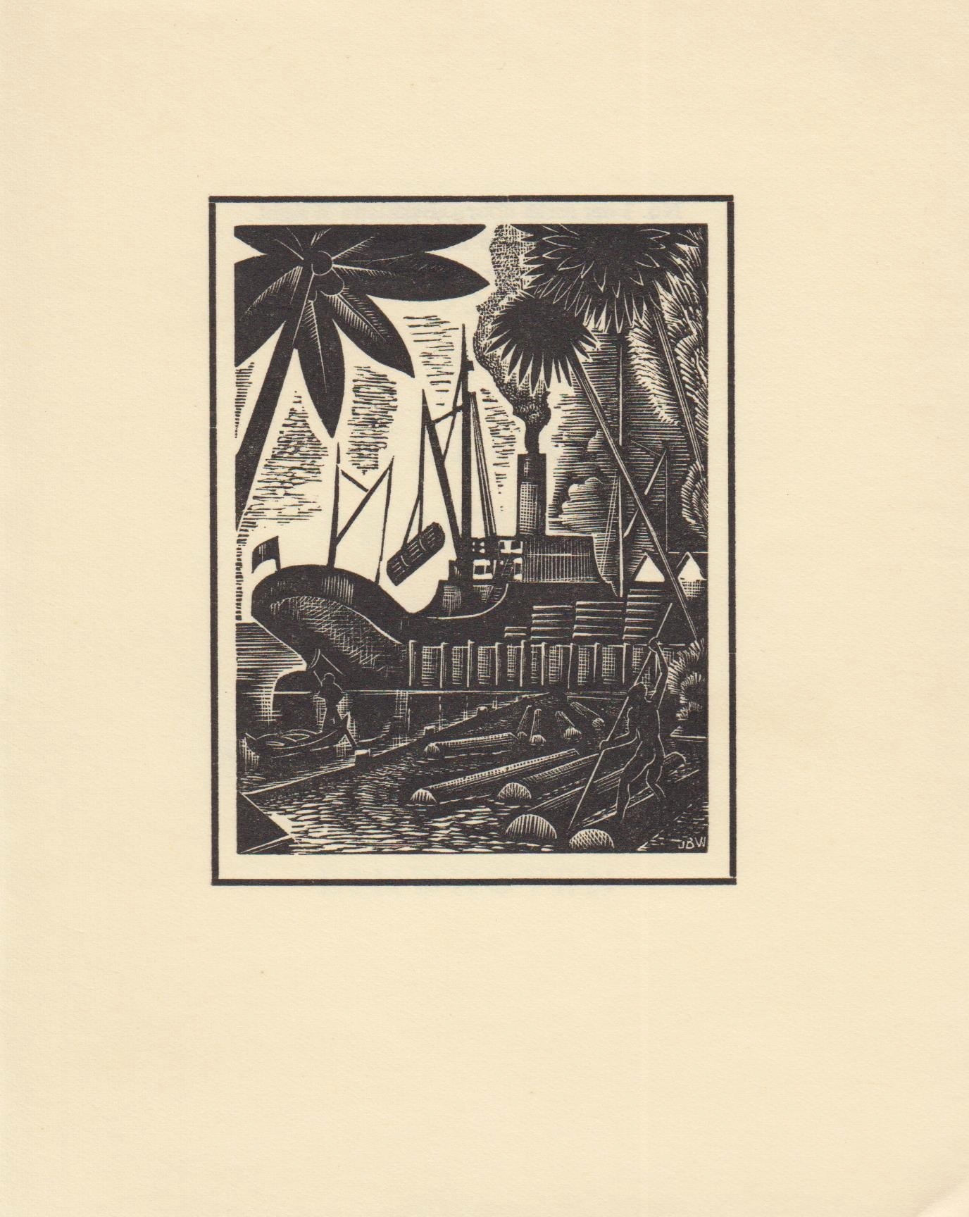 6. BUCKLAND WRIGHT, John Originele houtgravure. (Schip wordt geladen met boomstammen). Plano, geplakt op karton. 14,9 x 11,0 cm. Verkleurd en met vochtvlek onderaan.