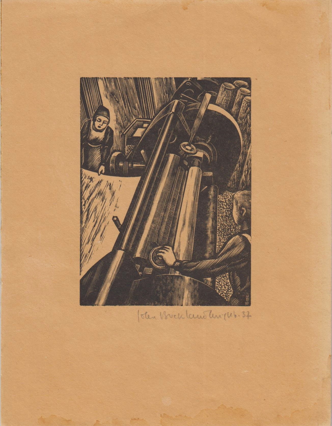 * Voluit gesigneerd en gedateerd ’37’ in potlood. Deze houtsnede werd gebruikt voor de vijfde nieuwjaarswens van Houtindustrie Picus.