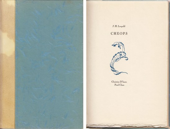 23. LEOPOLD, J.H. (CLAES, Paul, en Christine d’HAEN Cheops. (Met een Engelse vertaling door Christine d’Haen en Paul Claes). (Amsterdam, De Regulierenpers, 1985). Verguld halfperkament met platten van schitterend Japans vezelpapier (Binderij Phoenix). 40 p. Met de hand gezet uit de Gravure en gedrukt in blauw en zwart op Antiek Vergé in een oplage van 75 genummerde exemplaren. Tweetalige uitgave.