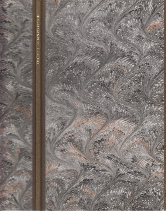 4. CAMPERT, Remco Rustig. Wijhe, (Hein Elferink), 1986. Grijs halfmarokijn met gemarmerde platten en marokijnen voorrand (Binderij Phoenix). (16) p. Met de hand gezet uit de Baskerville en gedrukt door Hein Elferink op Bütten Werkdruck in een oplage van 50 op de pers genummerde exemplaren. 1e druk.