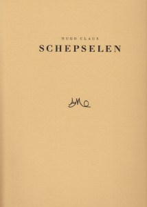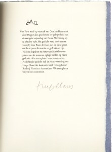 8. CLAUS, Hugo Voor Pierre. [Amstelveen], (AMO, 1987). 35,0 x 23,0 cm. Ingenaaid in een omslag van Zaans bord met rafelende scheprand. (8) p. Met de hand gezet uit de Romanée en gedrukt door Bram de Does in een minieme, ongenummerde oplage. 1e druk.