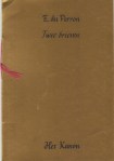 33. PERRON, E. du Twee brieven. Antwerpen, Het Kanon, 1983. Cahiersteek. (4), 8 p. Gezet uit de Xerox FB Boldface PC en gedrukt op Conqueror in een oplage van ‘exact’ 27 genummerde exemplaren. 1e druk. Deukje.