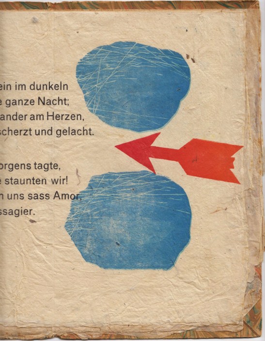 * Elementaire illustraties: klonten en pijlen in rood en blauw, gedrukt op nogal woest plantaardig papier dat je waarschijnlijk ook kunt bakken en opeten, als je geen bezwaar hebt tegen wat bast- en zandachtige insluitselen. In potlood gesigneerd door Puettmann.