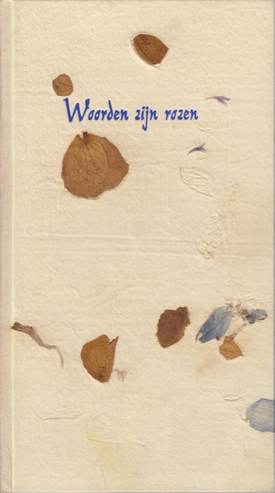 50. ZWANENBURG, Frouwkje Woorden zijn rozen. [Gouda], Condorpers, 2001. 34 x 14 cm. Karton met ingelegde bloemblaadjes. 34 p. Gezet uit de Romanée en Reinier Script en geïllustreerd met lino’s van Doortje de Vries. Gedrukt in 94 genummerde exemplaren. Gebonden door Wilma van Ipenburg, die ook het bebloemde papier schepte. 1e druk.