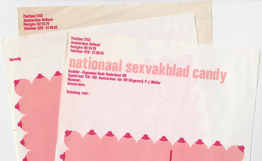 27. MULLER, NV Uitgeverij Peter J. Rekening Nationaal Sexvakblad Candy. (3 bladen). Amsterdam, NV Uitgeverij Peter J. Muller, (ca. 1970). A4. Eenzijdig gedrukt in rood en roze. Onderaan wordt in kleine letters de Candy Club vermeld, die van 1970-1972 aan het Thorbeckeplein gevestigd was. Keurig. Briefpapier iets verkleurd.