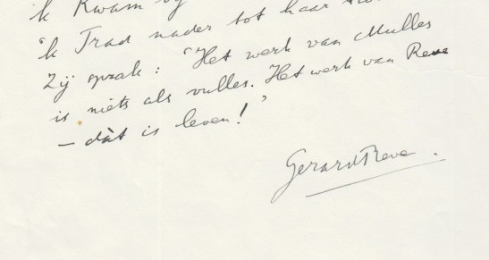 35. REVE, Gerard Handgeschreven aanzet voor een brief aan ‘Zeer geachte heer Kooiman’. 27,5 x 21,4 cm. Eén blad. Recto en verso. Niet gesigneerd en gedateerd Boslaan 34, Veenendaal. (U)./ 24 October 1971′. 5 regels tekst.