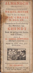* Bijzonder zeldzame zak-almanak in smal en hoog formaat. Het jaar 1715 niet in Worldcat, alleen 1721 (UAntwerpen Stadscampus).