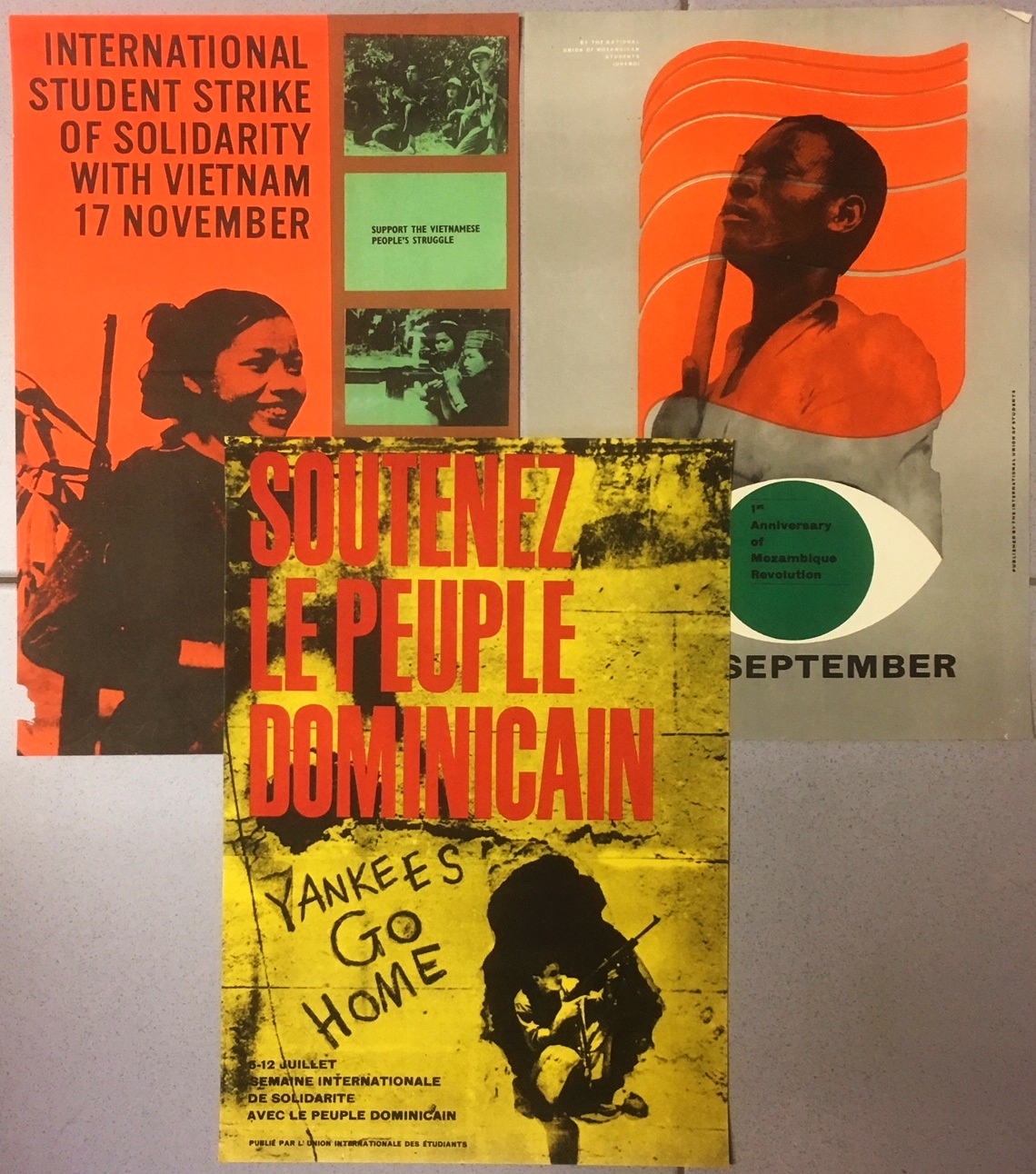 20. INTERNATIONAL UNION OF STUDENTS Drie politieke affiches 1965-1967. Zonder plaats, IUS (International Union of Students), 1965-ca. 1969. 40 x 28 cm. Gedrukt in kleuren. Punaisegaatjes, vouwtje. De Vietnamaffiche is vooral aan de achterkant wat meer beschadigd.