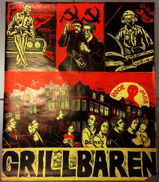* Indrukwekkende affiche met vier politieke platen, reclame voor de LP Grillbaren, van de Deense popgroep Røde Mor (‘Rode Moeder’).