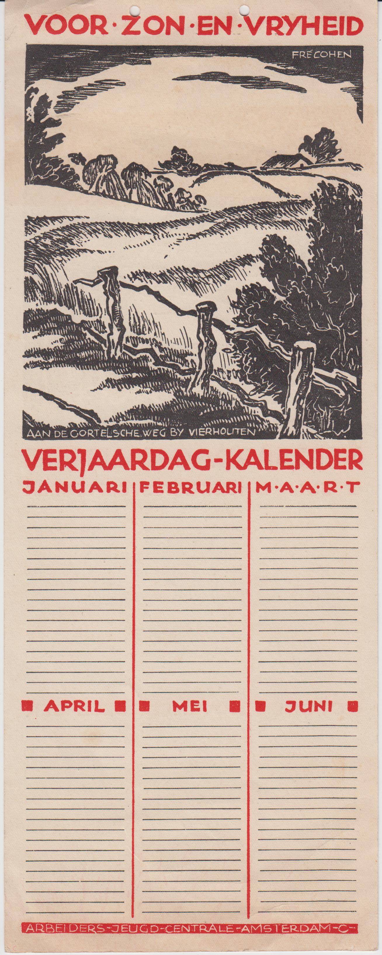 13. COHEN, Fré Verjaardag-kalender. Amsterdam, Arbeiders-Jeugd-Centrale, ca. 1930. Eén blad. 27,5 x 10,5 cm. Gedrukt in rood en zwart. Met aan beide kanten een linosnede van Fré Cohen, waarop een landschap bij Vierhouten te zien is (waar het A.J.C.-huis De Paasheuvel ligt). Zonder het ophangtouwtje. Niet ingevuld.