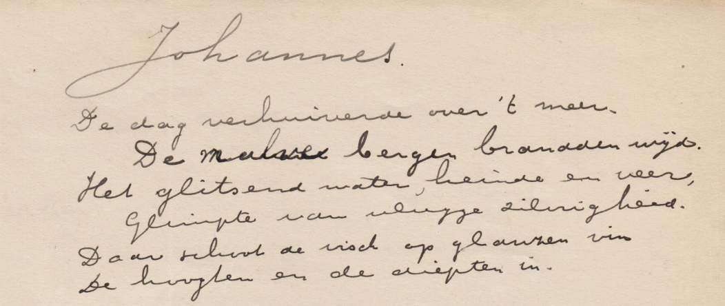 Bijgevoegd: ‘Johannes’. Drukproef met één verbetering door de auteur. Pagina 1/2 uit een onbekend tijdschrift, wellicht tweede helft jaren twintig. Horizontale vouw, langs de randen wat verbrokkeld, iets gevlekt.