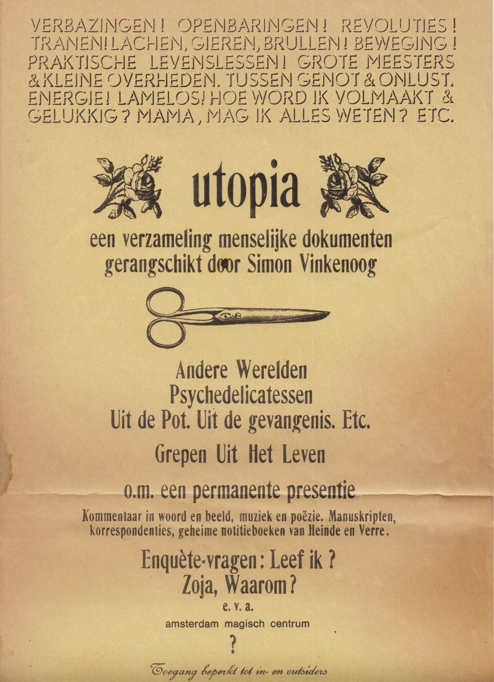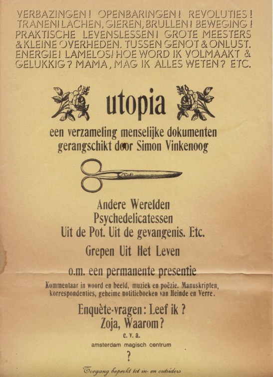 38. VINKENOOG, Simon Utopia, een verzameling menselijke documenten, verzameld door Simon Vinkenoog. (Affiche). Amsterdam, Galerie 20 d, Keizersgracht 518, 1966. 44 x 21 cm. Geelbruin papier, eenzijdig. 1e druk. Wat gevlekt, klein vouwtje onderaan, scheurtje.