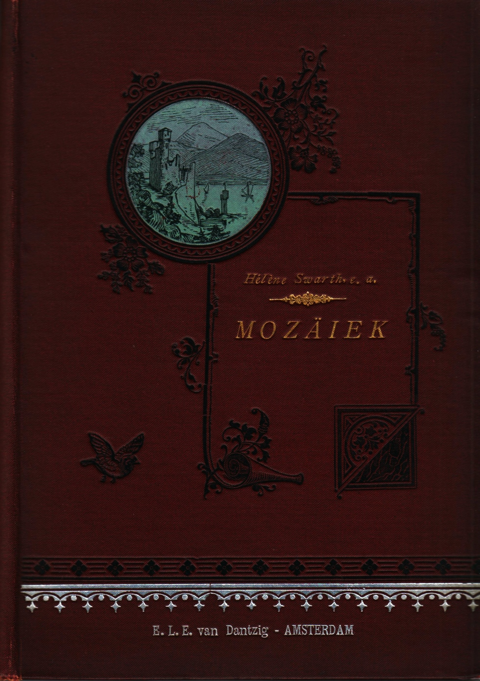 34. SWARTH, Hélène, J. KNOPPERS WKzn e.a. Mozäiek. Vertellingen voor jongens en meisjes. Purmerend, J. Muusses (titelpagina) / Amsterdam, E.L.E. van Dantzig (boekband), [1889]. Linnen met opdruk in goud, zilver, zwart en een afbeelding van een kasteel in grijs. (4), 144 p. Met 6 litho’s in kleuren op aparte bladen en veel zwartwit-illustraties in de tekst. 1e druk. In opvallend goede staat. Boekhandelsmerkje van A.J. Nuss/ C.L.C. Voskuil, Reguliersbreestraat, Amsterdam.