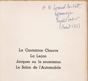 * Met op de Franse titel een opdracht van de schrijver: ‘A M. Samuel Beckett,/ hommage/ Eugène Ionesco/ Avril 1953’. Dit verbazende boek is afkomstig uit de bibliotheek van de graficus Jean-Paul Vroom: de ex-Parijzenaar Vroom ontwierp het decor voor de Nederlandse première van Becketts Wachten op Godot, in 1955 gespeeld door toneelgroep “Theater”, in de stadsschouwburg van Arnhem.