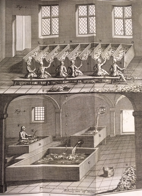 * Achterin aangevuld met ‘bylagen”: 14 soortgelijke uitklapplaten uit een ander, Franstalig boek. Dit is (het geheel zelfstandige) deel 9 van de Volledige Beschrijving van alle Konsten, Ambachten, Handwerken, Fabrieken, Trafieken, derzelver Werkhuizen, gereedschappen, enz. ten deele overgenomen uit de beroemdste buitenlandsche Werken; En vermeerderd met de Theorie en Praktijk der beste inlandsche Konstenaren en Handwerkslieden.