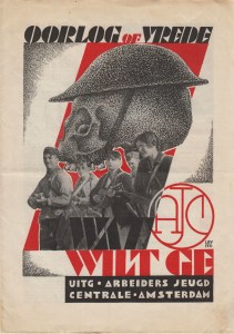 39. VORRINK, Koos, e.a. Oorlog of vrede. Wat wilt ge. Amsterdam, Arbeiders Jeugd Centrale, (1931). 30 x 21 cm. 16 p. Gedrukt in rood en zwart. Met bijdragen van Koos Vorrink, Arie Pleysier, W. Jos. de Gruyter, Johan Winkler, A.M. de Jong, C.S. Adama van Scheltema e.a. 1e druk. Enkele kreukjes.