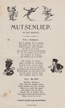 2. Mutsenlied in den marsch. Beginregel: ‘Dat is aardig, dat is aardig, dat geeft ons nog veel lol’.