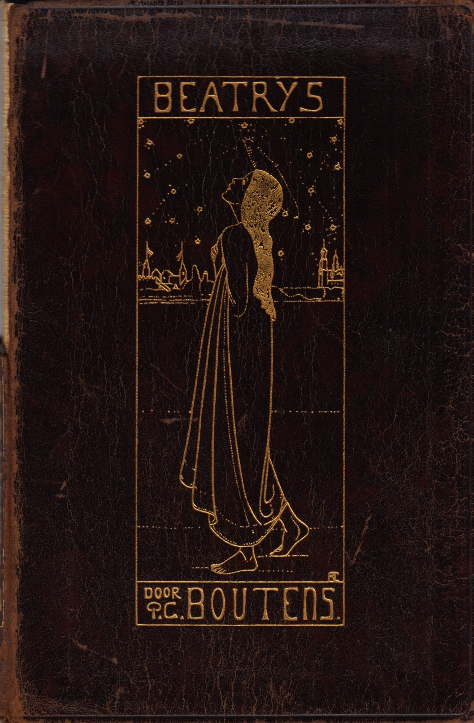10. BOUTENS, P.C. Beatrijs. Met een teekening van Rie Cramer. Bussum, Van Dishoeck, 1927. Origineel kalfsleer met in goud de tekening van Rie Cramer. 60 p. Op Van Gelder. 25e [= 28e] druk. Rug ontbreekt grotendeels. Slijtageplekjes en craquelé.
