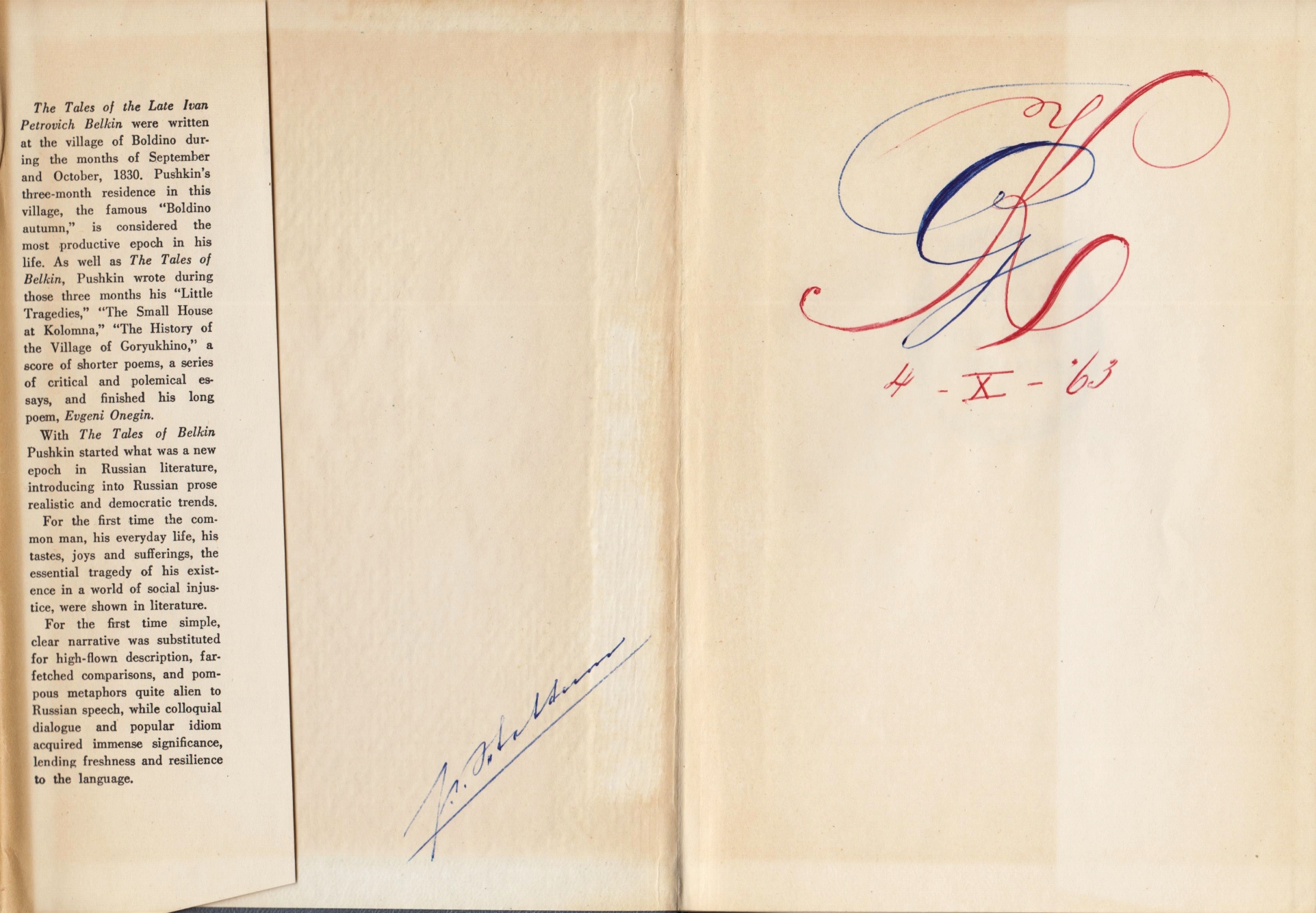 18. (HATTUM, Jac. van). PUSHKIN, A. The Tales of Ivan Belkin. Moskou, Foreign Languages Publishing House, 1954. Kunstleer met stofomslag. 112 p. Geïllustreerd. Netjes.