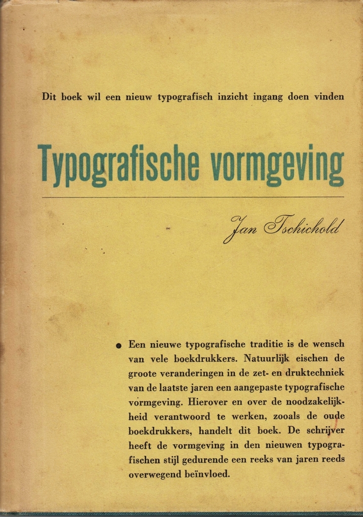 36. TSCHICHOLD, Jan Typografische vormgeving. Amsterdam, N.V. vh J.F. Duwaer & Zonen, 1938. Linnen met stofomslag. 108 p. Met illustraties. 1e druk. Omslag deels iets verkleurd en gevlekt, verder mooi.