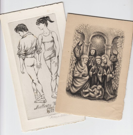 42. VROOM, Jean-Paul Meilleurs voeux pour 1955. Originele kopergravure, gesigneerd in de plaat en in potlood. Gevouwen blad, 19,5 x 10,5 cm. Beeldformaat 15,4 x 8,9 cm. Enkele roestvlekjes.