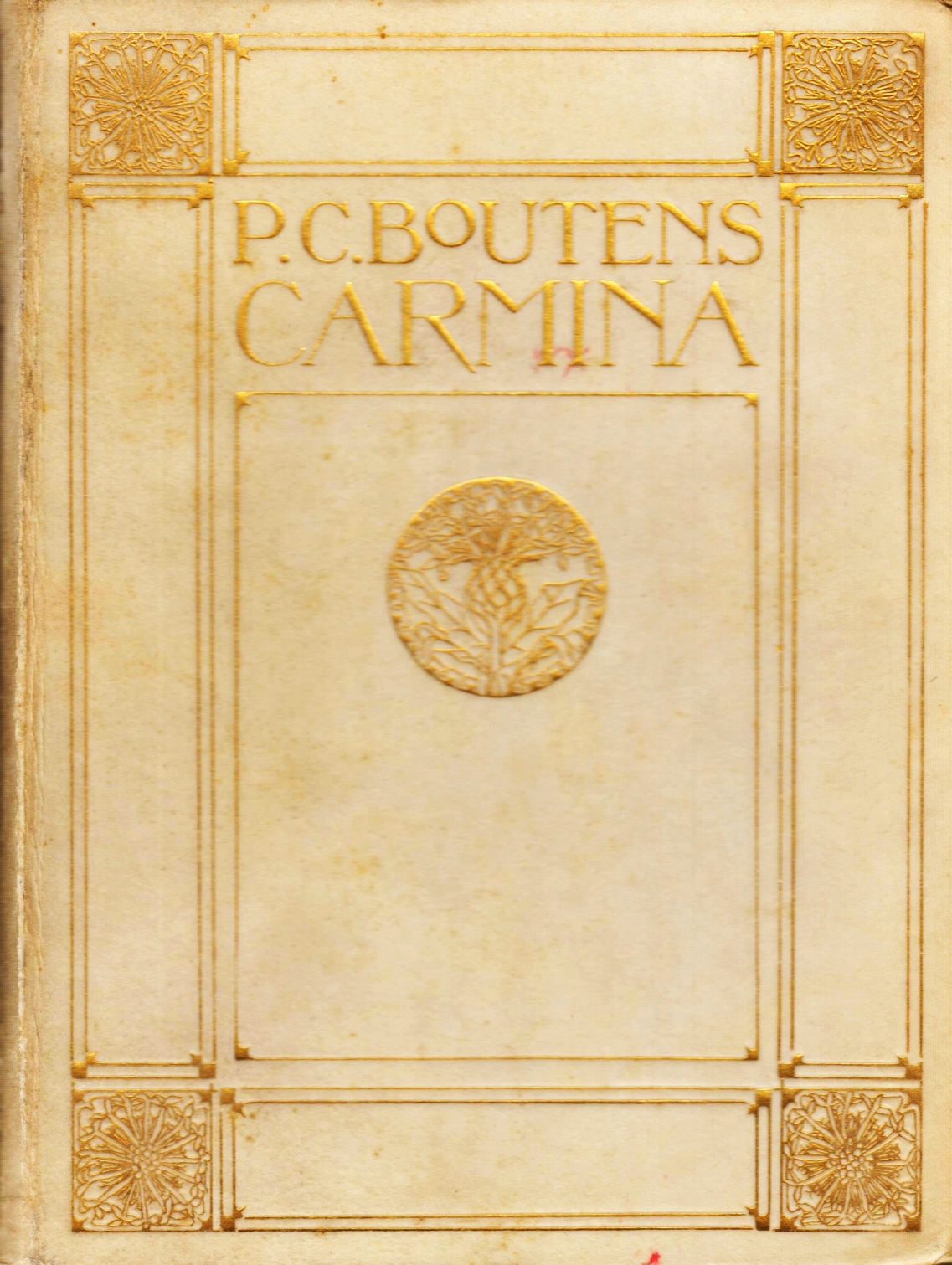 6. BOUTENS, P.C. Carmina. Amsterdam, Van Kampen, [1912]. Verguld heelperkament. Kop verguld. (4), 196 p. 1e druk. Perkament iets krom. Rood vlekje voorop. Enkele potloodaanstrepingen, vooral bij de opmerkelijkste woordscheppingen van Boutens.
