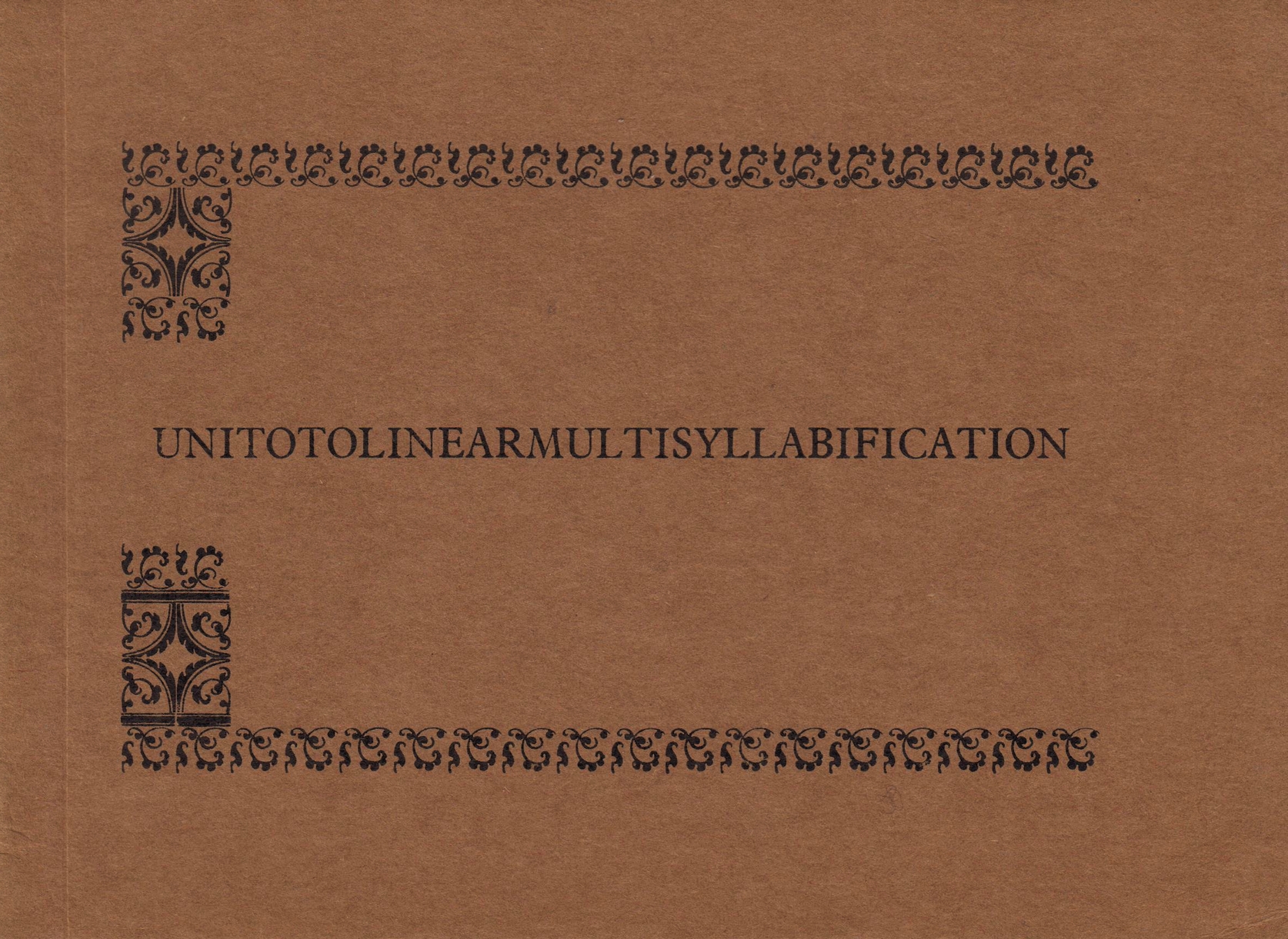 32. LUBRAN, Arthur Unitotolinearmultisyllabification or Long Words. A further exercise in sesquepedalian pomposity. London, Narbulla Agency, 1976. Oblong 15 x 20 cm. Stapled in original wrappers. 32 p. Printed in blue and black on grey-blue paper in 90 copies. Second edition. Book block has come loose from the covers.