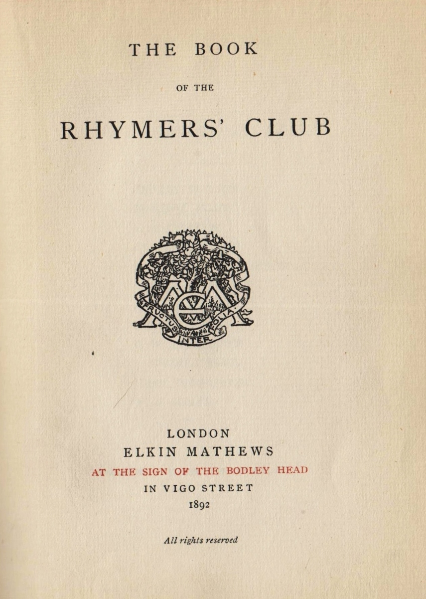 41. RHYMERS’ CLUB, The The Book of the Rhymers’ Club. (&) The Second Book of the Rhymers’ Club. London, Elkin Mathews, 1892. (&) London, Elkin Mathews & John Lane – New York, Dodd, Mead & Company, 1894. Two volumes. 16 x 13 cm. Original cloth. 1st editions. Both bindings a bit soiled. First volume inside excellent, except for two rubber stamps of the Irish Literary Society and an alternative line supplied in pencil in a poem by T.W. Rolleston. Second volume: flyleaves browned, otherwise excellent.