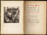 53. WARREN, John Leicester Warren, Lord DE TABLEY Poems Dramatic and Lyrical. With illustrations by C.S. Ricketts. London, Elkin Mathews and John Lane, 1893. Green cloth, richly decorated by Charles Ricketts. xiv, 216 p. Top gilt. Uncut. Printed in red and black in 600 copies. Spine somewhat dulled. Corners and lower spine a bit bumped. Some foxing at the end. First tissue guard missing. With inscription in the beginning ‘Russell B. Gill/ 1911’.