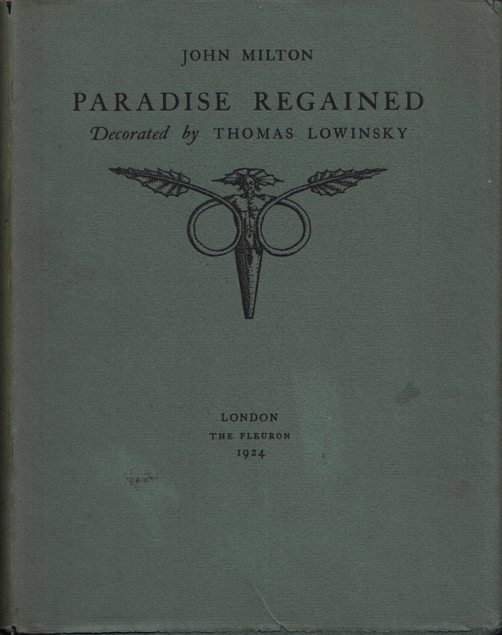 38. MILTON, John Paradise Regained. Decorated by Thomas Lowinsky. London, The Fleuron, 1924. Small 4to. Cloth-backed boards with dust jacket. (8), 88 p. 3 full-page illustrations and several head- and tailpieces. Printed on fine handmade paper in 350 numbered copies. DJ a bit spotted.