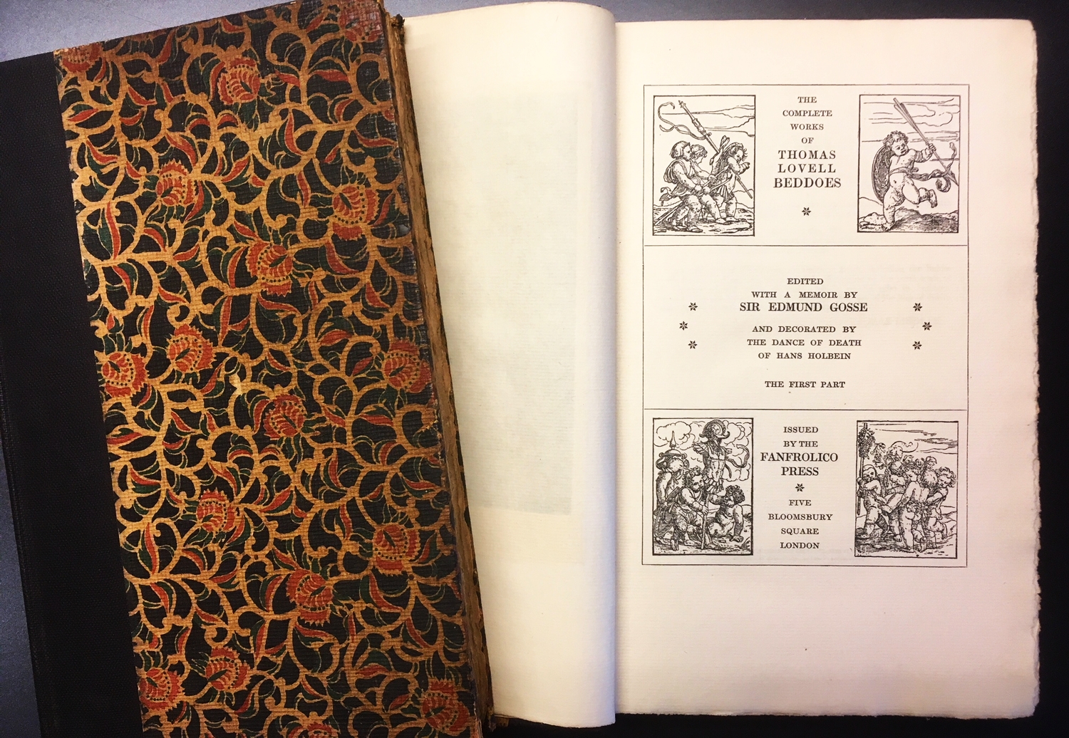 4. BEDDOES, Thomas Lovell The Complete Works. Edited with a Memoir by Sir Edmund Gosse and decorated by the Dance of Death of Hans Holbein. 2 vols. London, The Fanfrolico Press, [1928]. 26 x 16 cm. Cloth-backed decorated boards. (2), xxxvi, 590 p. Deckled edges. Printed in 750 numbered copies. 1st edition. Some browning. Lower edges a bit worn.