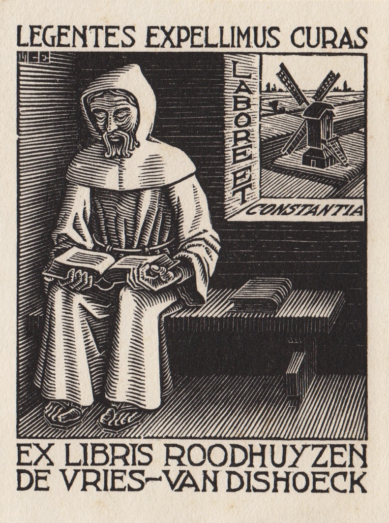 * Een tevreden monnik leest een boek bij het open raam, waarachter een molen te zien is. Erboven staat ‘Legentes expellimus curas’ (Als we lezen, verdrijven wij de zorgen) en in het raam staat ‘Labore et constantia’ (Door werk en gelijkmatigheid). Mooi! Bool 325.