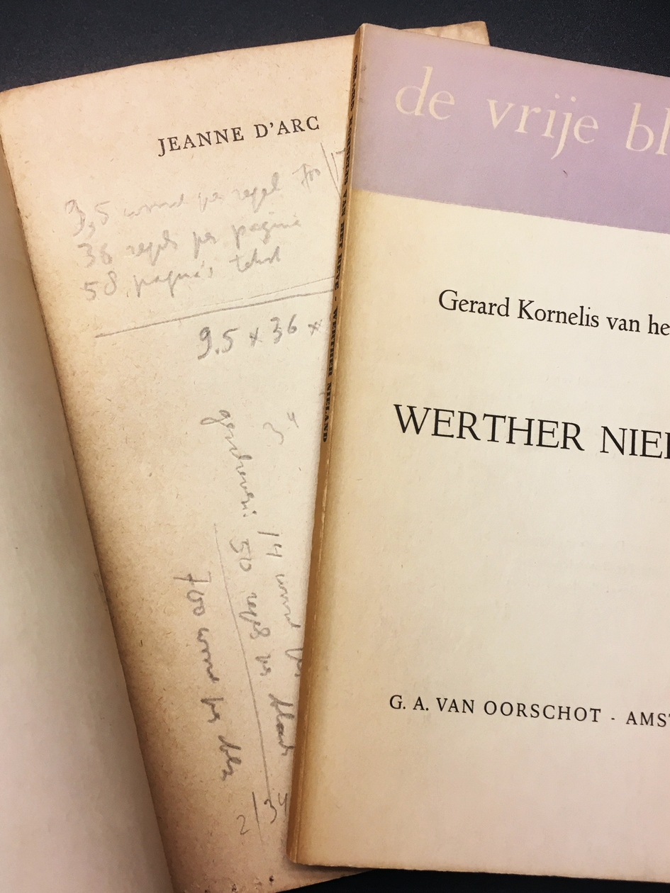 * Uit de bibliotheek van Gerard Kornelis van het Reve, die begin 1949 op de Franse titel met potlood allerlei vermenigvuldigingen en staartdelingen uitvoerde. Vermoedelijk rekende Reve met behulp van deze uitgave uit hoeveel woorden hij nodig had voor de in dezelfde reeks te verschijnen novelle Werther Nieland. Berekeningen als ‘9,5 woord per regel/ 36 regels per pagina/ 58 pagina’s tekst’ en ‘geschreven: 14 woord per regel/ 50 regels per bladz’ leidden uiteindelijk tot de conclusie ‘Ik moet dus leveren […]’.