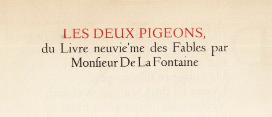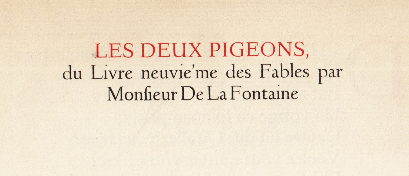 26. (KRIMPEN, J. van). LA FONTAINE, Jean de Les deux Pigeons. Du Livre neuvi’eme [sic] des Fables. Haarlem, Joh. Enschedé, 1925. 35 x 25 cm. 4 p. Gedrukt in rood en zwart door Joh. Enschedé en Zonen in een geringe oplage. Op Pannekoek. Ontwerp J. van Krimpen. Wat verbruind en gekreukt.