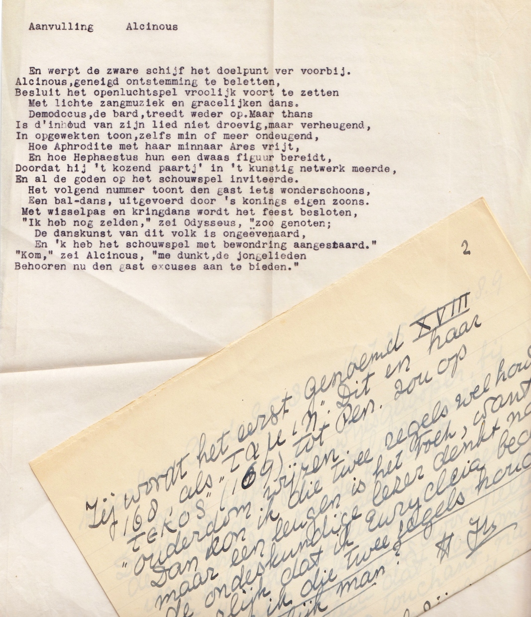11. CHARIVARIUS (= Gerard NOLST TRENITÉ) Collectie brieven aan Reinier van der Velde en typoscripten over vertalingen uit het Oudgrieks. 14 grotere en kleinere brieven, alle handgeschreven en gesigneerd, sommige dateerbaar dankzij bijbehorende envelop. Met twee omvangrijkere doorslagen van typoscripten, een vertaling van fragmenten van Herodotus (1937) en een van het begin van de Ilias van Homerus (1934-1935). De laatste met diverse kleinere doorslagen van proeven en schetsen.