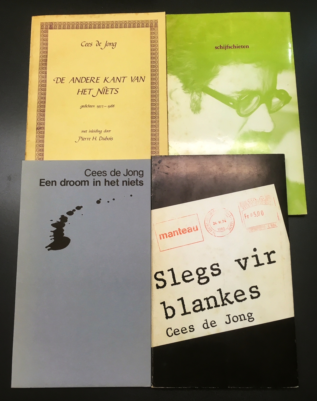 3. Een droom in het niets. Johannesburg, eigen beheer, 1987. 7 regels: ‘voor rob m’n vriend in/ woorden en in uitgeven er van/ dat je het mag genieten en/ knal ook maar je kritieken/ maar je stilte tot nu is/ een kwalijke zaak’. Opdracht gedateerd ‘Northcliff 23/10/87’.