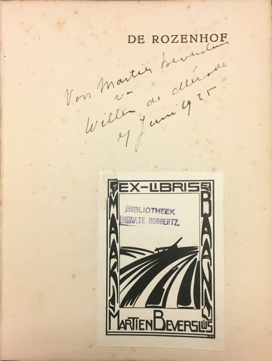 * Met handgeschreven, gesigneerde opdracht van de dichter op de eerste pagina: ‘Voor/ Martien Beversluis/ van/ Willem de Mérode/ 7 Juni 1925’. Daaronder is het exlibris van Beversluis geplakt: een eg op een eenzame akker, met het motto ‘Maak Baan’, waarop een stempeltje ‘Bibliotheek Dignate Robbertz’ – de schrijversnaam van Beversluis’ echtgenote Johanna Verstraate. Deze bundel is in zijn geheel in de gevangenis geschreven.