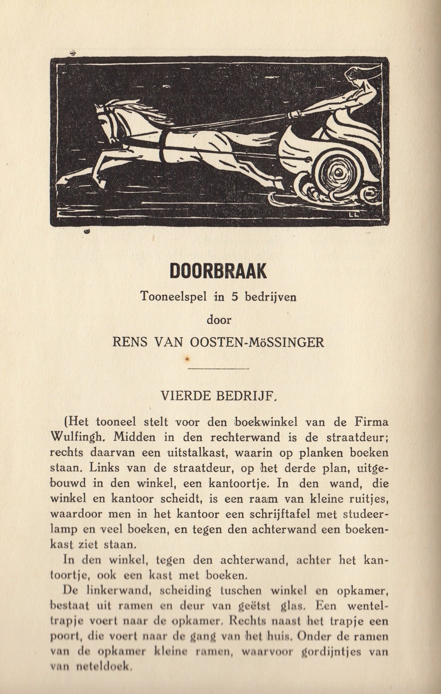 18. (JACOBS, Aletta). OOSTEN-MÖSSINGER, Rens van Doorbraak. Tooneelspel in 5 bedrijven. (Genomen uit het tijdschrift Nederland, 1931). Tekst in 5 afleveringen uit het literaire maandblad Nederland. Linnen. 86 p. Alle vijf bedrijven zijn voorzien van een (identieke) houtsnede, gesigneerd ‘LL’. 1e druk. Keurig.