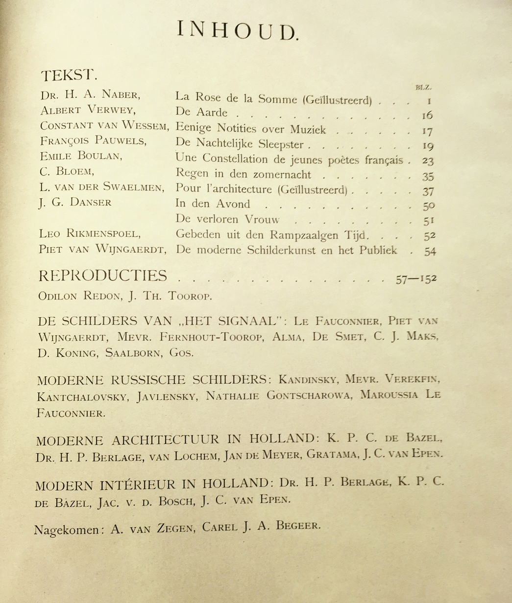 * Vroege publicatie van een gedicht van Bloem in een onverwacht tijdschrift, Het Signaal van de pasgestichte Bergense School. Pas vier jaar later werd het opgenomen in Bloems debuutbundel, Het verlangen. Ook met poëtische bijdragen van Albert Verwey en Jan Gustaaf Danser, beschouwingen van o.a. Piet van Wijngaerdt, en 48 zwart-wit-reproducties van kunstwerken die nog wel het duidelijkst de koers van de nieuwe kunstgroep aangeven: de twee voorbeeldigen, Odilon Redon en Jan Toorop, gevolgd door o.m. Kandinsky en Jawlensky (die evenals Van Wijngaerdt onlangs op belangrijke tentoonstellingen gevierd werden), Le Fauconnier, Gontsjarova, De Bazel, Berlage en Begeer.